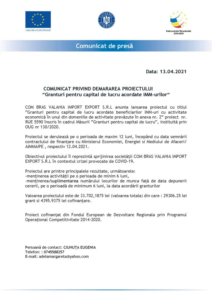 COM BRAS VALAHIA IMPORT EXPORT S.R.L anunta lansarea proiectul cu titlul ”Granturi pentru capital de lucru acordate beneficiarilor IMM-uri cu activitate economică în unul din domeniile de activitate prevăzute în anexa nr. 2” proiect nr. RUE 5590 înscris în cadrul Măsurii ”Granturi pentru capital de lucru”, instituită prin OUG nr 130/2020.
