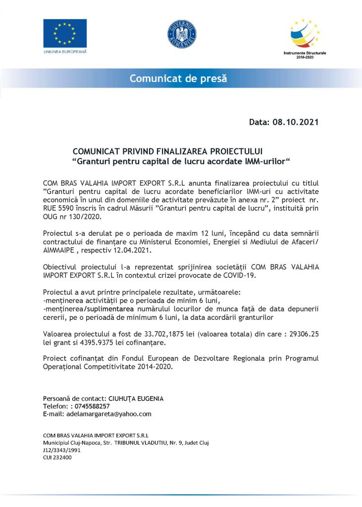 COM BRAS VALAHIA IMPORT EXPORT S.R.L anunta finalizarea proiectului cu titlul ”Granturi pentru capital de lucru acordate beneficiarilor IMM-uri cu activitate economică în unul din domeniile de activitate prevăzute în anexa nr. 2” proiect nr. RUE 5590 înscris în cadrul Măsurii ”Granturi pentru capital de lucru”, instituită prin OUG nr 130/2020.